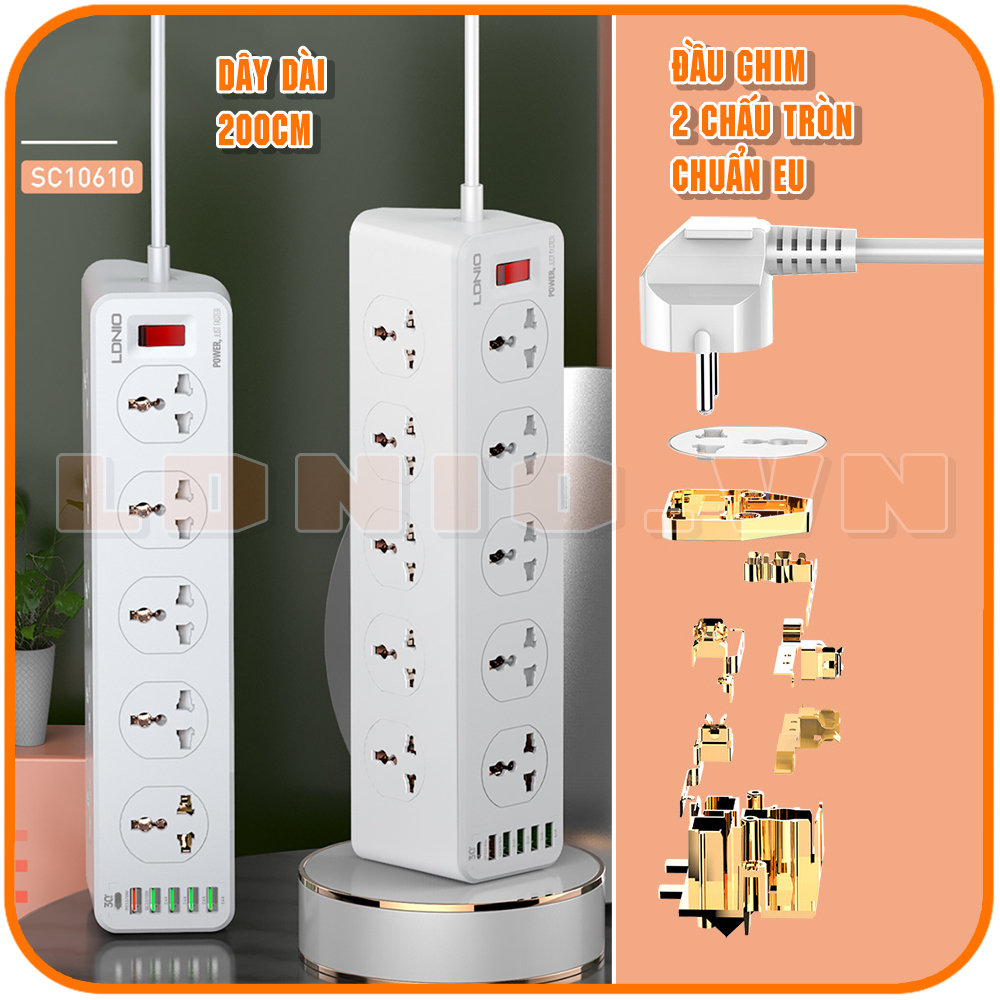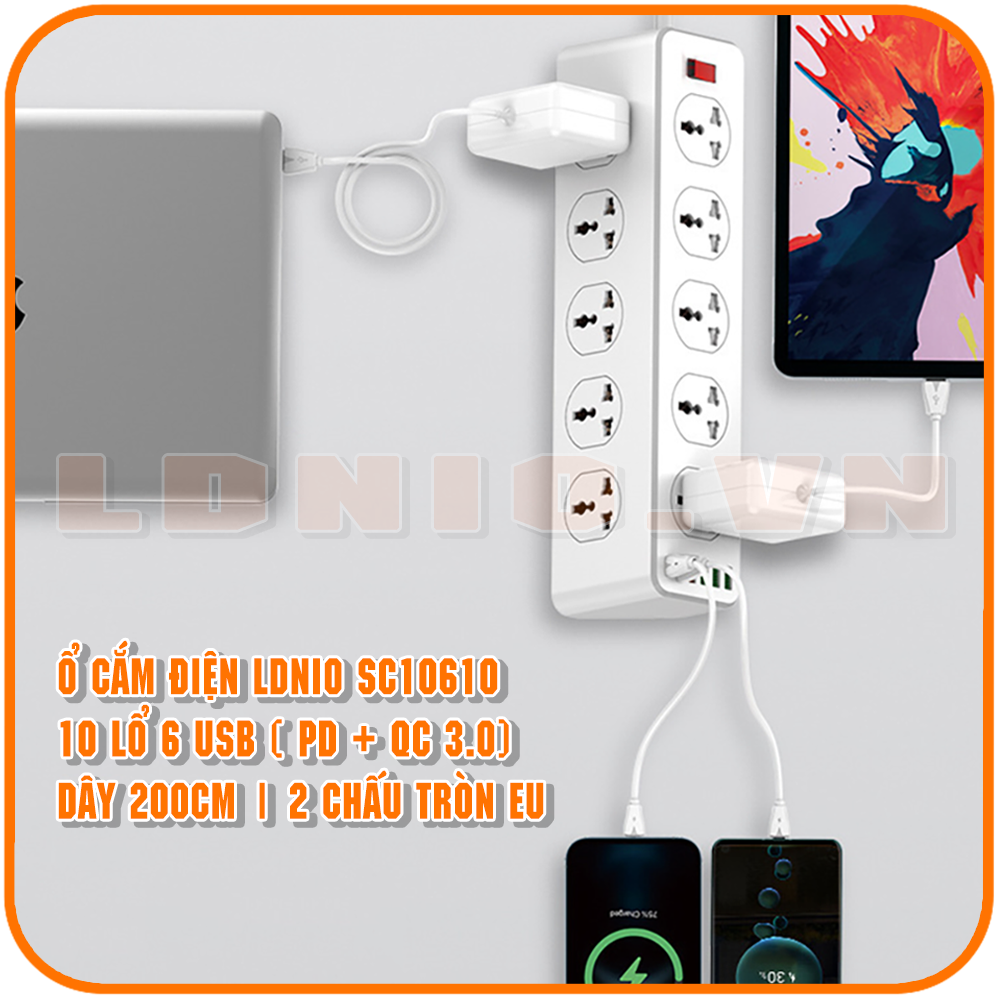 10 lổ cắm + 6 USB